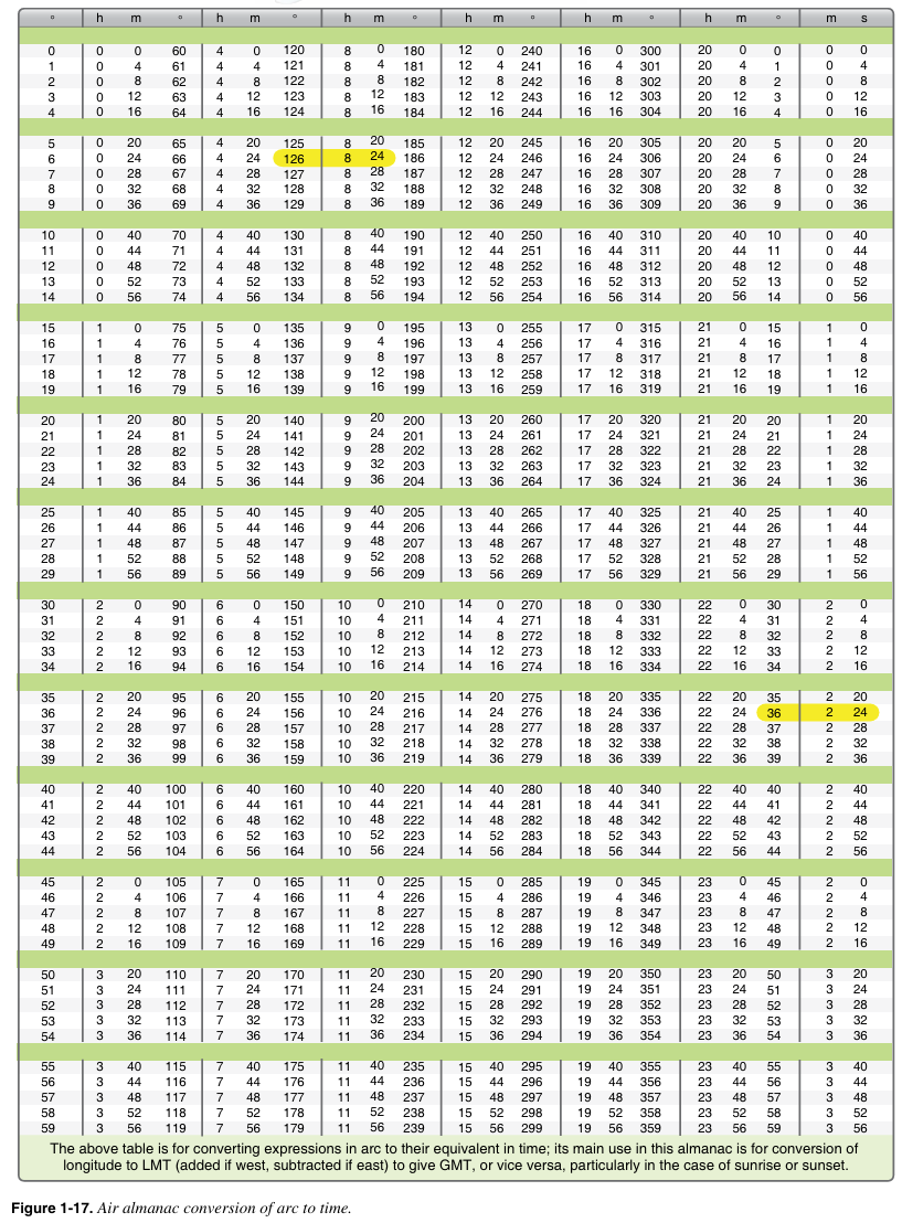 때로는 LMT를 GMT로, 혹은 GMT를 LMT로 변환해야 한다. Air Almanac에는 시간당 15°의 각도를 통해 각도를 시간으로 변환하는 표가 수록되어 있다. [그림 1-17] 이 변환 표는 LMT를 GMT로, 혹은 GMT를 LMT로 변환하는데 유효하다. zone time(ZT)은 일광절약시간제와 지리적 경계의 영향을 받는다. 예를 들어 서경 126° 36'에서 GMT를 LMT로 변환하려면: