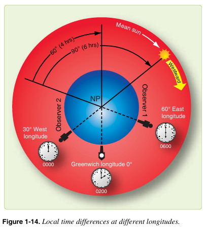 만약 두 자오선이 30° 떨어져 있으면 시간 차이는 2시간이다. 가장 동쪽에 있는 자오선은 더 늦은 지방시를 가지는데 왜냐하면 태양이 해당 자오선의 극하반원(lower branch)을 먼저 통과하였기 때문에 하루가 더 많이 흘러간 상태이기 때문이다. 그림 1-14는 태양이 동경 60° 자오선에 있는 관측자 1의 극하반원을 통과하고 4시간(60÷15) 후에 그리니치 자오선의 극하반원을 통과하고 30° 자오선에 있는 관측자 2의 극하반원을 6시간(90÷15) 후에 통과하였음을 보여준다. 따라서 동경 60°에서의 지방시는 각각의 해당 시간만큼 늦어진다.
