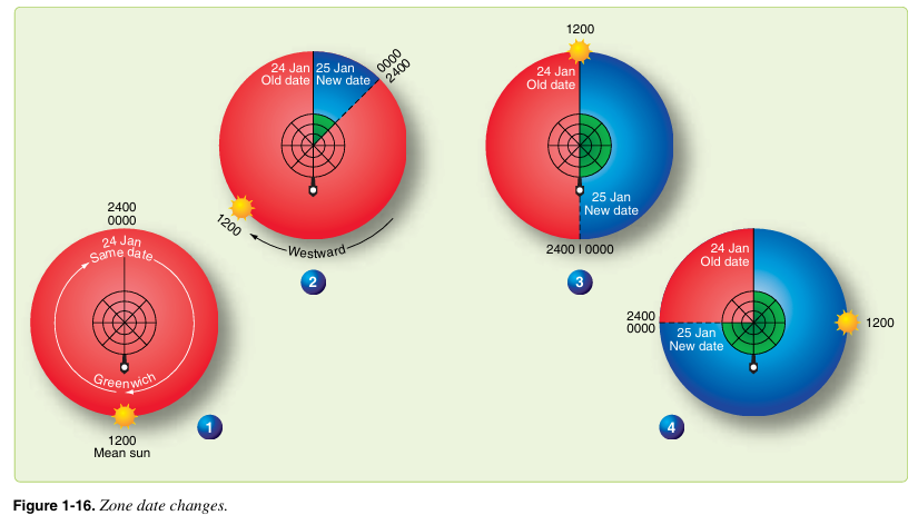 현지 날짜는 2400(혹은 자정)에 변경된다. 따라서 평균태양이 자오선의 극하반원을 통과할 때 날짜가 변경된다. 다른 방식으로 상황을 고려해보자. 평균태양의 시간권(hour circle)은 양 극에서 절반으로 나뉜다. 태양으로부터 절반 떨어진 지점(극하반원)의 현지 시간은 항상 자정이다. 극하반원이 서쪽으로 이동함에 따라 극하반원이 이전 날짜(old date)를 밀어내고 새로운 날짜(net date)를 끌고 온다. [그림 1-16] 극하반원이 180° 자오선에 접근함에 따라 이전 날짜의 영역은 줄어들고 새로운 날짜의 영역이 증가한다. 극하반원이 날짜 변경선에 도달할 때(즉, 평균태양이 그리니치 자오선을 통과할 때) 이전 날짜가 밀려나고 그 순간부터 새로운 날짜가 전 세계에 적용된다. 그런 다음 극하반원이 날짜 변경선을 통과하면 극하반원의 동쪽에서 더 새로운 날짜가 시작되며 이 과정이 반복된다. 특정 시간대의 날짜는 midnight zone time(ZT)에 변경되거나 평균태양의 극하반원이 해당 시간대의 중앙 자오선을 통과할 때 변경된다.