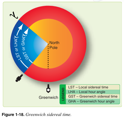 항성일(sidereal day)은 춘분점이 관측자 자오선의 극상반원(upper branch)을 통과할 때 시작된다. 지방항성시(LST – Local sidereal time)란 춘분점이 관측자의 자오선으로부터 서쪽을 향해 얼마나 이동했는가를 시간으로 나타낸 값이다. 이를 시간 대신 각도로 표현하면 춘분점의 지방시간각(LHA – local hour angle)과 동일하다. [그림 1-18] 그리니치에서의 지방항성시를 그리니치항성시(GST – Greenwich sidereal time)라 하며 이는 춘분점의 GHA와 동일하다. 춘분점의 그리니치항성시나 그리니치시간각은 지구와 관련하여 별들의 위치를 나타낸다. 따라서 특정 별은 매일 동일한 항성시마다 지구와 관련하여 동일한 위치에 있다.