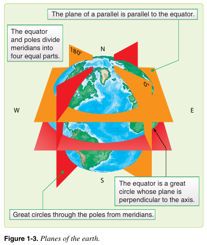 지구는 하루에 한 번 남극과 북극을 잇는 축을 중심으로 회전한다. 적도면은 이 축의 중간 지점에서 축에 수직으로 형성된다. [그림 1-3] 양 극을 통과하는 대권을 자오선(meridian)이라 하며 이러한 방식을 통해 무수히 많은 대권들이 그려질 수 있다. 각 자오선은 적도와 양 극에 의해 네 개의 사분면으로 나뉜다. 원은 360°이므로 각 사분면은 90°이다.
