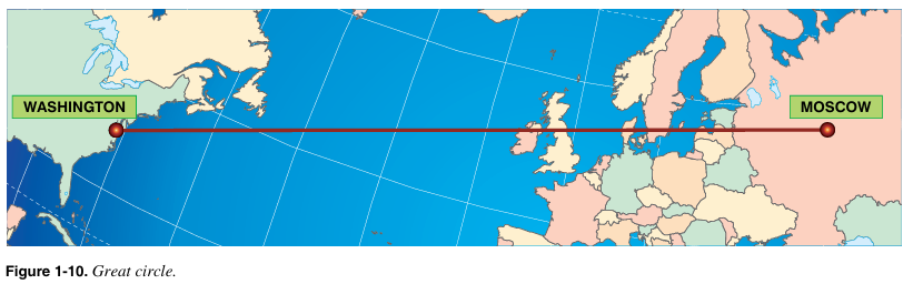 그림 1-10에 표시된 대권의 방향은 워싱턴 D.C 근처의 자오선과 약 40°의 각도를 이루고, 아이슬란드 근처의 자오선과는 약 85°의 각도를 이루며, 모스크바 근처의 자오선과는 더 큰 각도를 이룬다. 즉, 대권의 방향은 경로가 진행됨에 따라 지속적으로 변화하며 대권을 따라 모든 지점에서 달라진다. 이러한 경로를 비행하려면 방향을 지속적으로 변경해야하며 일반적인 조건에서는 비행이 어려울 것이다. 허나 그럼에도 불구하고 이는 두 지점 사이의 최단 거리이기 때문에 가장 바람직한 경로이다.