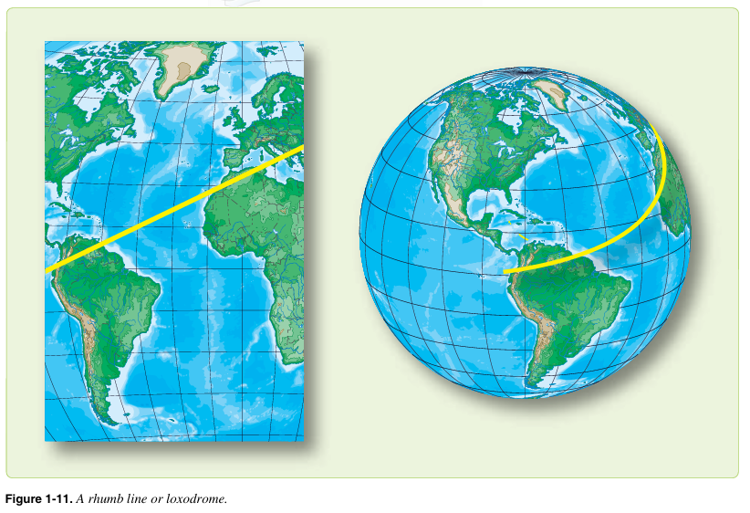 각 자오선과 동일한 각도를 이루는 선을 항정선(rhumb line)이라 한다. 일정한 진기수방위(true heading)를 유지하는 항공기는 항정선을 비행하게 된다. 이러한 경로를 비행하면 이동 거리는 더 길어지지만 항법이 용이해진다. 항정선을 따라 비행하게 되면 일정한 진방향을 유지하면서 양 극을 향해 나선형으로 접근하지만 결코 양 극에 도달하지는 못한다. 이렇게 형성된 나선형 궤적을 loxodrome이나 loxodromic curve라 부른다. [그림 1-11]
