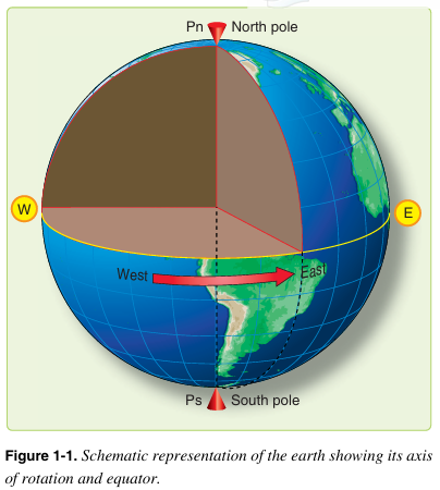 그림 1-1에서 polar north(Pn), east(E), polar south(Ps), 그리고 west(W)는 지구의 표면을 나타낸다. Pn과 Ps는 회전축을 나타낸다. 지구는 서쪽에서 동쪽으로 회전한다. Pn, W, Ps가 포함된 반구의 모든 지점들은 이 그림을 보고 있는 당신을 향하여 다가오는 반면 반대쪽 반구에 있는 모든 지점들은 이 그림을 보고 있는 당신으로부터 멀어진다. W와 E를 연결하는 둘레를 적도라 부르는데 이는 지구의 중심을 통과하고 회전축에 수직을 이루는 지표면상의 가상의 원으로 정의된다.