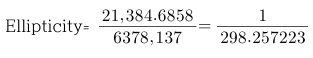 적도에서 측정한 지구의 지름은 약 6,378,137m인 반면 극에서 측정한 지구의 지름은 약 6,356,752.3142m이다. 이 지름들 간의 차이는 21,384.6858m이며 이 차이가 지구의 타원율을 나타내는데 사용될 수 있다. 지름들 간의 차이와 적도 지름 사이의 비율은 다음과 같다: