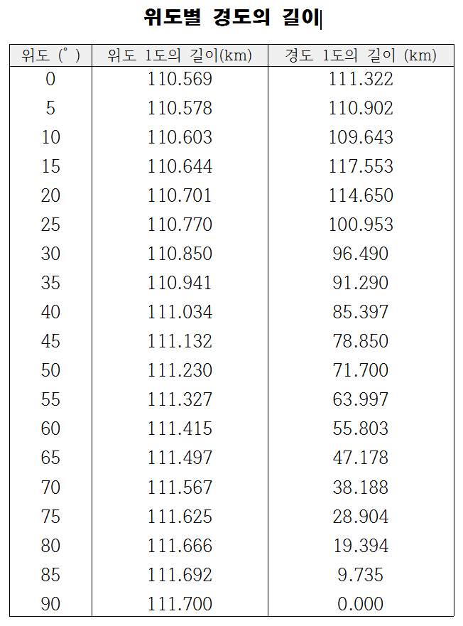 위도 1° 간의 거리는 거의 변함이 없지만 경도 1° 간의 거리는 고위도로 갈수록 짧아지고, 북위 90°와 남위 90°가 되는 지점인 양극에서는 "0"이 된다.