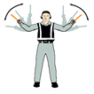 오른팔과 유도봉을 몸쪽 측면으로 직각으로 세운 뒤 왼손으로 직진신호를 한다. 신호동작의 속도는 항공기의 회전속도를 알려준다. | |