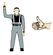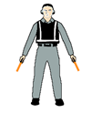 머리 위로 팔을 뻗어 왼손을 수평으로 손바닥이 보이도록 하고, 오른손의 손가락 끝이 왼손에 닿게 하여 "T"자 형태를 취한다. 밤에는 광채가 나는 유도봉을 이용하여 "T"자 형태를 취할 수 있다. | |
