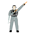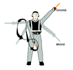 오른팔을 머리 높이로 들면서 유도봉을 위를 향한다. 유도봉으로 원 모양을 그리기 시작하면서 동시에 왼팔을 머리 높이로 들고 엔진시동 걸 위치를 가리킨다. | |