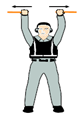팔과 유도봉을 머리 위로 쭉 뻗는다. 유도봉이 서로 닿을 때 까지 안쪽으로 유도봉을 움직인다. 운항승무원에게 인지표시를 반드시 수신하도록 한다. | |