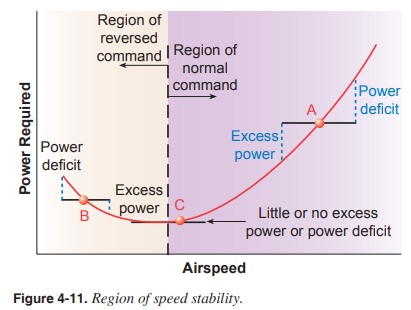region of reversed command에서의 비행 특성은 그림 4-10의 B 지점에 나타나 있다. 항공기가 B 지점에서 안정적인 수평 비행을 수행하는 경우 양력과 무게는 같으며 power available은 power required와 동일하게 설정된다. 만약 속도가 B 지점보다 크게 증가하면 excess power가 발생한다. 이는 항공기가 더 빠른 속도로 가속하게 만든다. 만약 항공기가 B 지점보다 낮은 속도로 감속하면 power deficiency가 발생한다. 항공기는 훨씬 더 낮은 속도로 계속 감속하는 경향을 보인다.