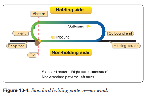 무풍 상황에서 standard holding pattern을 수행하는 경우 그 순서는 다음과 같다: (1) holding fix를 향하여 특정 inbound course를 비행 (2) 우측으로 180도 선회 (3) outbound course를 1분간 비행 (4) 우측으로 180도 선회 (5) fix로 향하는 inbound course 비행. [그림 10-4]