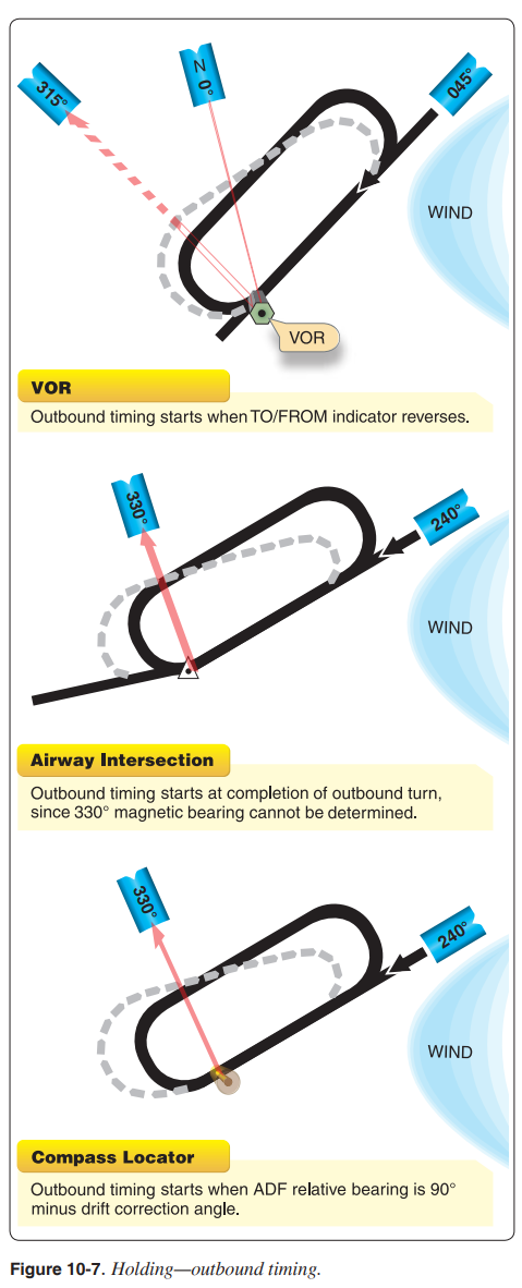ATC에 보고하는 holding pattern 진입 시간은 fix를 통과한 첫 번째 순간이다. holding pattern에 진입하였다면 첫 번째 outbound leg를 1분간(14,000ft MSL 이하일 경우), 혹은 1분 30초간(14,000ft MSL 초과일 경우) 비행한다. 적절한 inbound leg 시간을 달성하기 위해선 차후의 outbound leg 시간을 조절해야 한다. 조종사는 fix over나 fix abeam 중 나중에 완료된 때로부터 outbound 시간을 재기 시작해야 한다. abeam 위치를 결정할 수 없다면 outbound로 향하는 선회가 완료되었을 때 시간을 재기 시작한다. [그림 10-7]