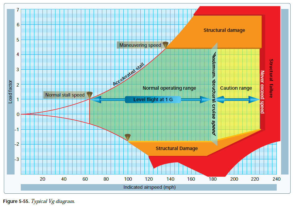 항공기의 운영 강도가 그래프에 표시된다. [그림 5-55] 그래프의 수직 눈금은 하중 계수를 기초로 한다. 이 도표를 Vg diagram(Vn diagram이라고도 불림)이라 부른다. 각 항공기는 특정 무게 및 고도에 유효한 본인만의 Vg diagram을 가진다.