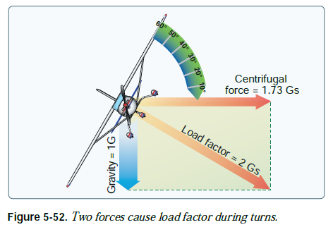 일반적인 범용 항공 항공기가 고도를 유지하면서 선회를 할 때 사용하는 대략적인 최대 bank는 60도이다. 60도의 bank, 그리고 60도 bank에 필요한 출력은 범용 항공 항공기를 한계에 도달하게 만든다. bank가 10도 더 가해지면 하중 계수가 약 1G 증가한다. 이는 해당 항공기에 설정된 항복점(yield point)에 근접하게 만든다. [그림 5-54]