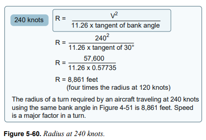 선회 반경을 결정하는 또 다른 방법은 초 당 피트(fps-feet per second) 속도, 파이(π=3.1415), 그리고 선회율을 사용하는 것이다. 초 당 5.25도의 선회율을 가진 항공기는 완전한 원을 만드는데 68.6초가 필요하다. 항공기의 속도(노트)에 상수 1.69를 곱하면 fps로 변환될 수 있다. 따라서 120노트(TAS)로 이동하는 항공기는 202.8fps로 움직인다. 완전한 원을 만드는데 걸리는 시간(68.6초)에 fps 속도(202.8)를 곱하면 원의 길이를 결정할 수 있다(202.8 x 68.6 = 13,912ft). 이를 파이(π)로 나누면 지름 4,428ft가 나오며 이를 2로 나누면 반지름 2,214ft가 나온다. [그림 5-61] 이는 그림 5-59의 공식을 통해 결정된 값과 거의 동일하다.