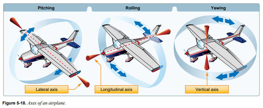 항공기의 축들은 항공기의 CG를 통과하는 세 개의 가상 선으로 구성된다. 이러한 축들은 항공기가 회전하는 가상의 축으로 간주될 수 있다. 세 개의 축들은 서로 90도 각도로 CG를 통과한다. 기수로부터 꼬리로 향하는 선에 평행한 축이 세로축(longitudinal axis)이고, 한 쪽 wingtip으로부터 다른 쪽 wingtip으로 향하는 선에 평행한 축이 가로축(lateral axis)이며, 이 두 축과 직각을 이루는 축이 수직축(vertical axis)이다. 비행 자세가 바뀔 때마다 항공기는 세 개의 축들 중 하나 이상을 통해 회전한다. [그림 5-18]