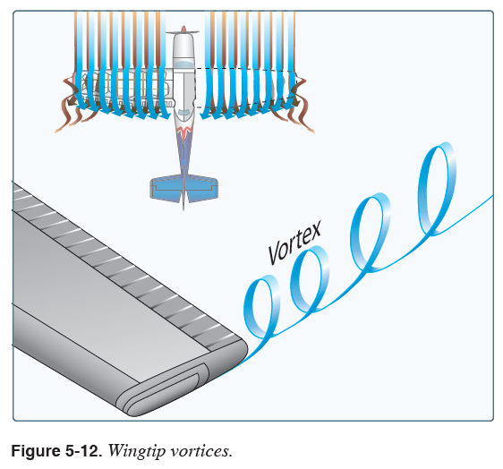 그림 5-12를 보면 wingtip vortices가 형성되는 것을 쉽게 확인할 수 있다. 와류의 강도는 항공기의 무게에 비례하고 항공기의 날개 길이와 속도에는 반비례한다. 항공기가 무겁고 느릴수록 받음각은 커지고 wingtip vortices는 강해진다. 따라서 항공기는 이륙, 상승, 그리고 착륙 구간에서 최대 강도의 wingtip vortices를 생성한다. 이러한 와류는 비행에 특히 위험한 항적 난기류(wake turbulence)를 발생시킨다.
