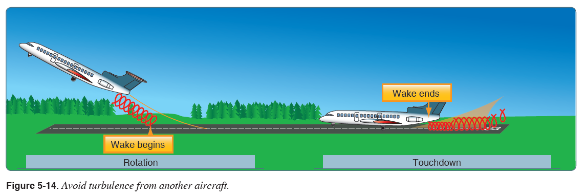 바람은 항적 난기류를 피하는데 있어 중요한 요소이다. 왜냐하면 wingtip vortices는 바람의 속도에 따라 편류하기 때문이다. 예를 들어 10노트의 바람은 와류를 1분 안에 약 1,000ft 편류시킨다. 선행 항공기가 존재하는 경우 조종사는 이착륙 지점을 선택할 때 풍향/풍속을 고려해야 한다. 만약 선행 항공기의 이착륙 지점을 확신할 수 없다면 약 3분의 시간이 항적 난기류 소산을 위한 안전 여유를 제공한다. [그림 5-15] wake turbulence에 대한 자세한 내용은 AC 90-23, Aircraft Wake Turbulence를 참조한다.