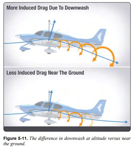 downwash는 상대풍을 아래로 향하게 만든다. 따라서 downwash가 많을수록 상대풍이 아래로 향한다. 양력은 항상 상대풍에 수직이므로 이는 매우 중요하다. 그림 5-11을 보면 downwash가 적을 때 양력 벡터가 중력에 대해 더 수직으로 발생한다는 것을 알 수 있다. downwash가 많아지면 양력 벡터가 뒤로 향해서 유도 항력이 만들어진다. 게다가 날개가 downwash와 vortices를 생성하려면 에너지가 필요한데 이 에너지가 항력을 만든다.