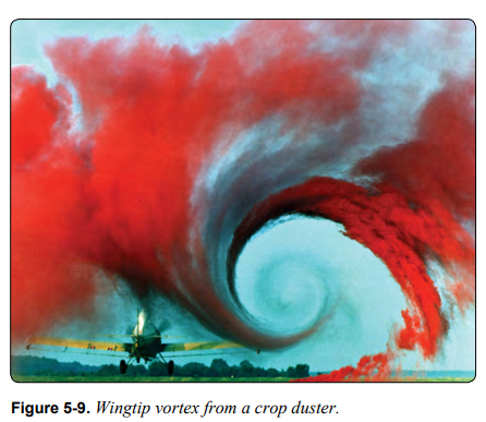 항공기를 꼬리에서 바라보았을 때 와류는 우측 wing tip에서 반시계 방향으로, 그리고 좌측 wing tip에서 시계 방향으로 돈다. [그림 5-9] 공기가 날개 뒤쪽에서 흘러 나오면서 아래로 기울어지는데 이를 downwash라 부른다. 그림 5-10은 공중에서의 downwash와 지면에서의 downwash를 보여준다. 와류가 tip 바깥쪽에서는 upward flow를 발생시키고 tip 안쪽에서는 downwash flow를 발생시키는 것을 확인할 수 있다. 이러한 downwash는 양력 생산에 필요한 downwash와 다르다.