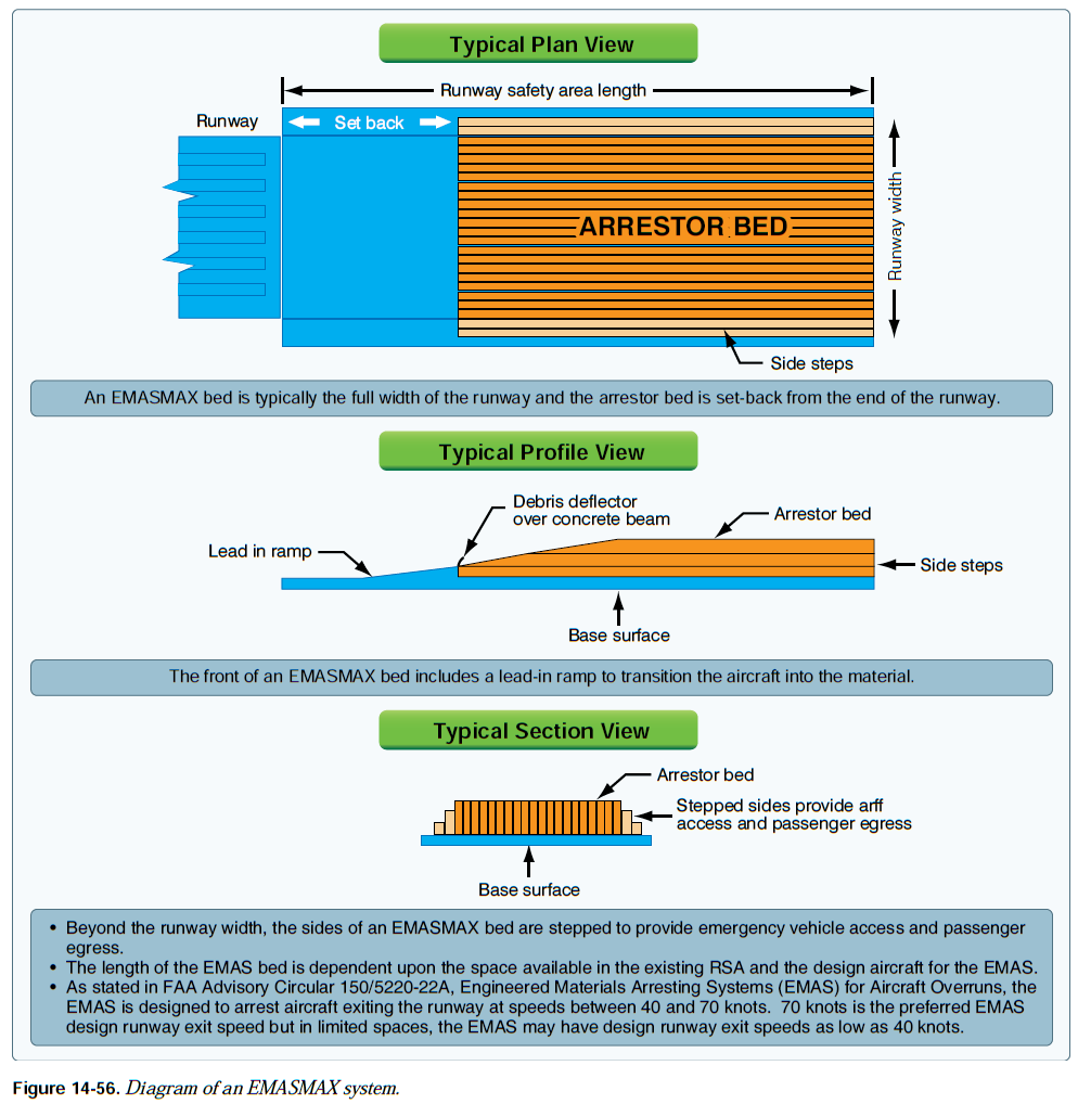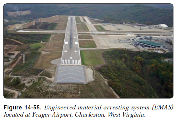 이러한 사고들 중 가장 위험한 것은 overrun이다. 허나 1,000ft의 RSA가 채택되기 전에 건설된 공항들이 많기에 full standard RSA를 달성할 수 없는 공항들이 존재한다. 이는 수역, 고속도로, 철도, 인구 밀집 구역, 혹은 급경사면과 같은 장애물들 때문이다. 이러한 특정 상황에서는 EMAS(Engineered Materials Arresting System)가 RSA를 대체할 수 있다. EMAS는 보통 full RSA와 동일한 수준의 안전성을 제공한다. [그림 14-55]
