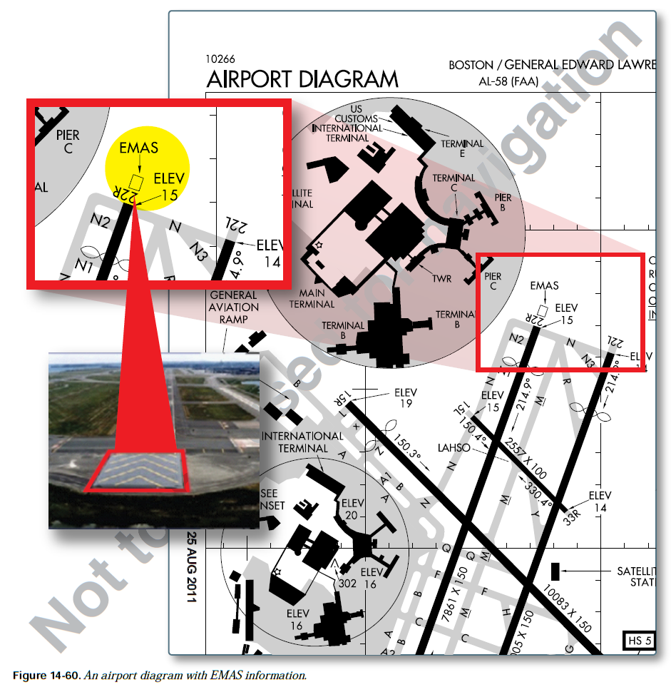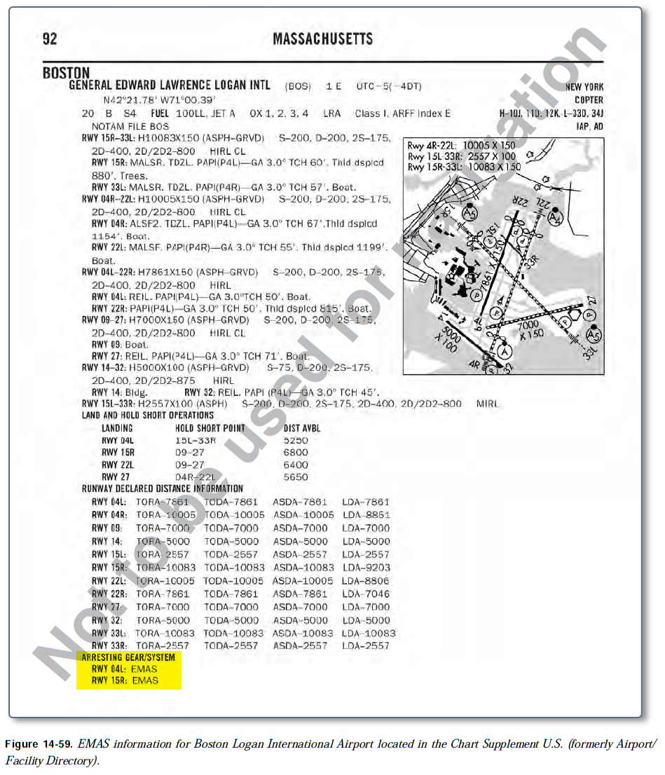 EMAS 정보는 Chart Supplement U.S.의 특정 공항 정보 아래에서 확인할 수 있다. 그림 14-59는 Boston Logan International Airport의 공항 정보를 보여준다. 어떤 활주로에 arresting system이 장착되어 있는지, 그리고 arresting system이 어떤 종류인지가 페이지 하단에 나타나 있다. 조종사는 공항 정보를 연구해야 하고, arresting system의 세부사항과 한계를 알아야 하며, arresting system을 갖춘 활주로를 숙지해야 한다. [그림 14-60]