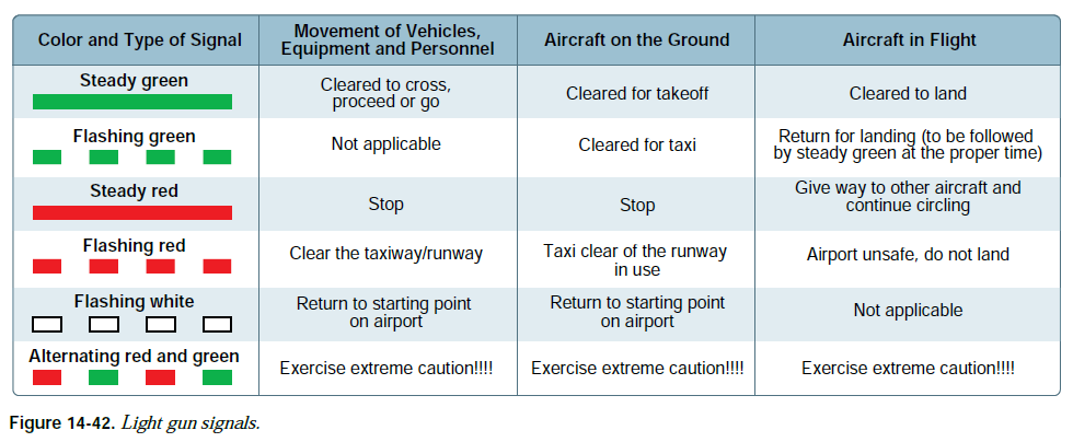 교신 두절이 발생할 수도 있으며 이로 인해 송신기나 수신기가(혹은 둘 다) 작동하지 않을 수 있다. 만약 수신기가 작동하지 않는 상태에서 관제탑이 운영되는 공항에 착륙해야 한다면 항적의 방향과 흐름을 확인하기 전까지는 D등급 공역의 바깥이나 위에 머무는 것이 좋다. 그런 다음 조종사는 항공기의 형식, 위치, 고도, 그리고 착륙 의도를 관제탑에 알려야 한다. 이후 조종사는 교통장주에 진입하고, 적절히 위치를 보고하고, 관제탑으로부터의 빛총 신호(light signal)를 확인해야 한다. 빛총 신호의 색깔과 그 의미가 그림 14-42에 포함되어 있다.
