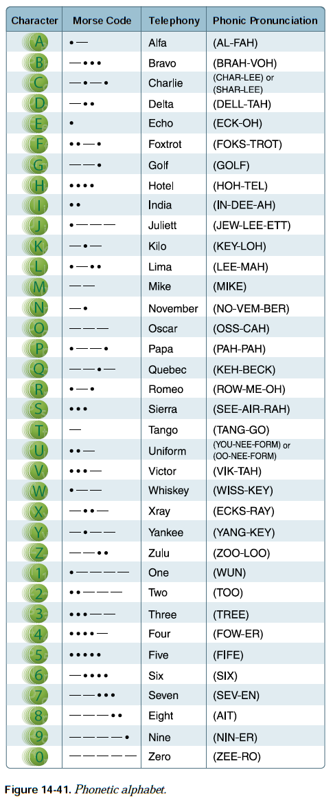 ICAO는 무선 통신에 사용되어야 하는 음성 문자(phonetic alphabet)를 채택하였다. ATC와 교신할 때 조종사는 이 알파벳을 통해 자신의 항공기를 식별해야 한다. [그림 14-41]