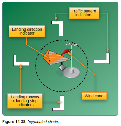 운영 중인 관제탑이 없는 공항의 경우 교통장주 정보를 위해 segmented circle visual indicator system이 설치될 수 있다. [그림 14-38] 이는 보통 공중과 지상에 있는 조종사에게 가장 잘 보이도록 위치하며 시스템의 다른 요소들을 위한 중앙 위치를 제공한다. segmented circle은 다음 요소들로 구성된다: wind direction indicators, landing direction indicators, landing strip indicators, 그리고 traffic pattern indicators.