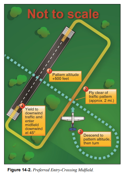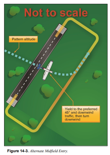 다른 방법으로는 교통장주 고도에서 midfield crosswind에 진입하고, 항적을 주의 깊게 살핀 다음, 의도를 알리고, downwind로 선회한다. [그림 14-3] 패턴이 바쁜 경우에는 이 기법을 사용해선 안 된다. 첫 번째 방법으로 진입하는 항공기, 그리고 이미 downwind에 설정된 항공기에게는 항상 양보를 해야 한다.