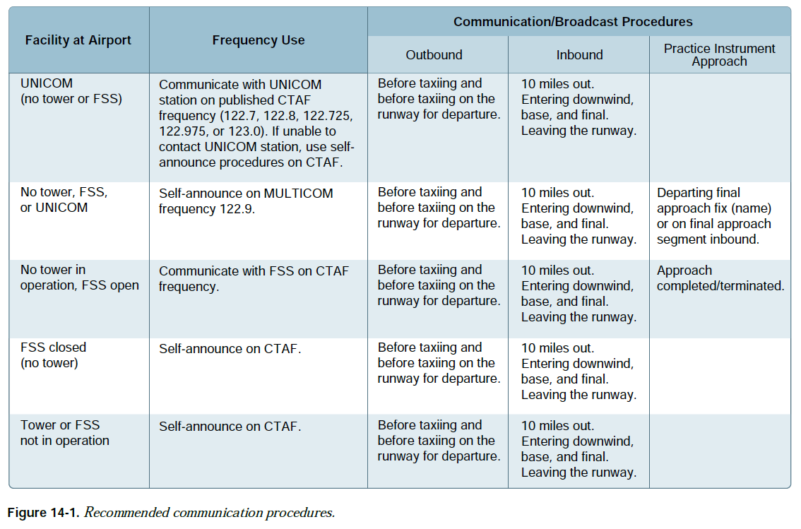 nontowered airport에는 운영 중인 관제탑이 없다. 양방향 무선 교신이 필요하지는 않지만 그 지역의 다른 항적을 위해 특정 주파수로 본인의 의도를 송신하는 것이 좋다. 관제탑이 운영되지 않는 공항에서 교신을 수행하는 요점은 정확한 공통 주파수를 선택하는 것이다. CTAF(Common Traffic Advisory Frequency)는 운영 중인 관제탑이 없는 공항을 오가는 동안 airport advisory practices를 수행하도록 지정된 주파수이다. CTAF는 UNICOM(Universal Integrated Community), MULTICOM, FSS(FLight Service Station), 혹은 관제탑 주파수일 수 있으며 이는 해당 항공 간행물에서 식별된다. UNICOM이란 관제탑이나 FSS가 없는 대중 공항에서 공항 정보를 제공할 수 있는 민간 공대지 무선 교신국이다. 조종사가 요청할 경우 UNICOM 기지국은 날씨 정보, 풍향, 권장 활주로, 혹은 그 외 필요한 정보를 제공할 수 있다. UNICOM 주파수가 CTAF로 지정될 경우 이는 해당 항공 간행물에서 식별된다. 그림 14-1은 권장 교신 절차를 열거한다. 무선 교신에 대한 자세한 내용은 이 장의 뒷부분에 설명되어 있다.