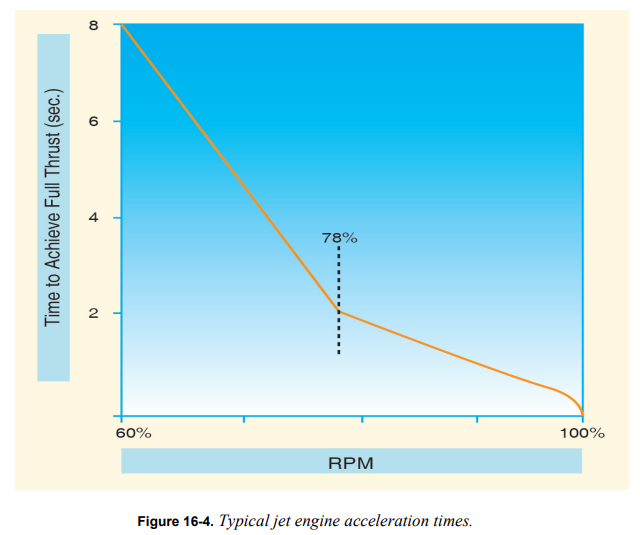 피스톤 엔진에서는 idle에서 full power까지의 가속이 비교적 빠르다. 허나 제트엔진에서는 보통 idle에서 full power까지의 가속이 훨씬 느리다. 경우에 따라 full power로 전환하는데 최대 10초가 걸릴 수 있다. [그림 16-4] 낮은 출력 설정일 때 조종사는 출력을 추가해야 할 필요성을 예상해야 한다.