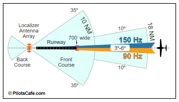 2. localizer의 접근 경로를 front course라 부르며 glide slope, marker beacons 등과 같은 그 외 기능적 장치들과 함께 사용된다. localizer 신호는 활주로의 반대쪽 종단에서 전송된다. 해당 신호는 활주로 시단에서 full scale fly-left ~ full scale fly-right까지의 전체 폭이 700ft가 되도록 조정된다.