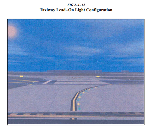 d. Taxiway Centerline Lead-On Lights. taxiway centerline lead-on lights는 활주로를 진입하는 조종사에 시각적 안내를 제공한다. 조종사는 해당 등화를 통해 본인이 runway environment나 ILS critical area 중 더 제한적인 구역 내에 있음을 알 수 있다. lead-on lights는 lead-off lights와 같은 색깔 패턴을 나타낸다. lead-on lights를 위해 사용되는 등화는 양방향으로 작동한다. 즉, 한 쪽은 lead-on 기능을 위해 빛을 발하는 반면 다른 한 쪽은 lead-off 기능을 위해 빛을 발한다. lead-off 기능을 위해 노란색 빛을 발하는 모든 등화는 lead-on 기능을 위해서도 노란색 빛을 발해야 한다. (그림 2-1-12 참조.)