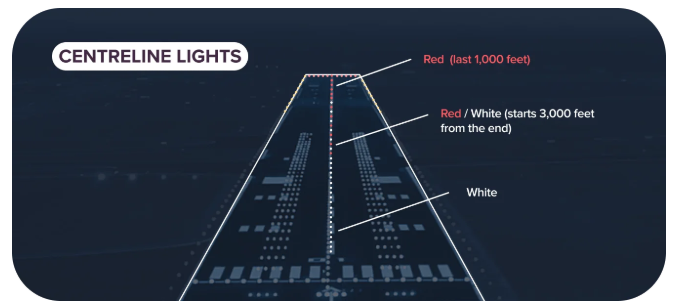 a. Runway Centerline Lighting System(RCLS). 저시정 조건에서의 착륙을 용이하게 만들기 위해 일부 정밀 계기 활주로(precision instrument runway)에는 활주로중심선등(runway centerline lights)이 설치된다. RCLS는 활주로 중심선을 따라 50ft 간격으로 배치된다. 착륙 시단에서 바라보았을 때 RCLS는 활주로 종단으로부터 3,000ft(900m) 전까지 흰색이다. 이후 2,000ft(600m) 구간 동안 흰색과 빨간색이 번갈아 나타나고 활주로의 마지막 1,000ft(300m) 구간에서는 모든 중심선등이 빨간색이다.