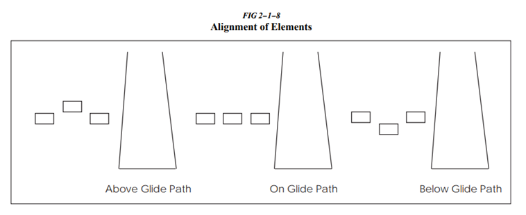 e. Alignment of Elements Systems. alignment of elements systems는 일부 작은 general aviation airports에 설치되며 이는 보통 검은색과 흰색, 혹은 형광 주황색이 칠해진 합판 패널로 구성된 저비용 시스템이다. 이러한 시스템들 중 일부는 야간 운영을 위해 빛이 켜진다. 이 시스템의 유효 범위는 대략 3/4마일이다. 이 시스템을 사용하려면 조종사는 element들이 정렬되도록 항공기를 위치시켜야 한다. glide path 지시는 그림 2-1-8에 나타나 있다.
