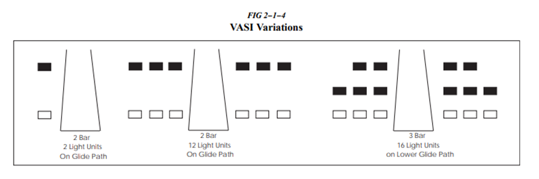 (계기비행증명: 활주로에 접근하는 동안 모든 VASI 등화들이 빨간색으로 보인다면, 활공 경로가 정상보다 낮은 것이므로 적절한 접근경로에 진입할 때까지 수평비행을 유지해야 한다.)