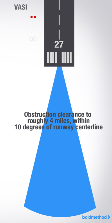 4. VASI는 활주로 접근 도중 시각 강하 유도 정보를 제공하도록 배치된 등화 시스템이다. 주간에는 3 ~ 5마일 지점에서, 그리고 야간에는 최대 20마일 너머에서 이 등화들을 볼 수 있다. VASI의 시각 활공 경로는 활주로 중심선으로부터 ±10도 이내에서, 그리고 활주로 시단으로부터 4NM 이내에서 장애물 회피를 제공한다. 육안으로 항공기와 활주로를 정렬하기 전까지는 VASI를 이용하여 하강하지 않는다. 수평 경로 유도 정보는 활주로나 활주로 등화가 제공한다. 특정 상황에서는 지역적 한계로 인해 빔의 폭을 줄이거나 사용 가능 거리를 단축함으로써 장애물 회피 구역을 감소시킬 수 있으며 VASI가 활주로 중심선으로부터 offset 될 수도 있다. 해당 정보는 Chart Supplement U.S. 및/혹은 해당 NOTAM(Notices to Air Missions)에 수록된다.