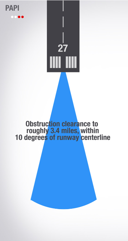b. Precision Approach Path Indicator(PAPI). PAPI는 VASI와 유사한 등화 장치를 사용한다. 다만 PAPI는 2개나 4개의 등화를 일렬로 설치한다는 점이 VASI와 다르다. 주간에는 대략 5마일 지점에서, 그리고 야간에는 최대 20마일 지점에서 이 등화들을 볼 수 있다. PAPI의 시각 활공 경로는 일반적으로 활주로 중심선으로부터 ±10도 이내에서, 그리고 활주로 시단으로부터 3.4NM 이내에서 장애물 회피를 제공한다. 육안으로 항공기와 활주로를 정렬하기 전까지는 PAPI를 이용하여 하강하지 않는다. 한 줄로 된 등화들이 보통 활주로의 왼쪽 측면에 설치되며 활공 경로는 아래와 같이 표시된다. 수평 경로 유도 정보는 활주로나 활주로 등화가 제공한다. 특정 상황에서는 지역적 한계로 인해 빔의 폭을 줄이거나 사용 가능 거리를 단축함으로써 장애물 회피 구역을 감소시킬 수 있으며 PAPI가 활주로 중심선으로부터 offset 될 수도 있다. 해당 정보는 Chart Supplement U.S. 및/혹은 해당 NOTAM에 수록된다. (그림 2-1-5 참조.)