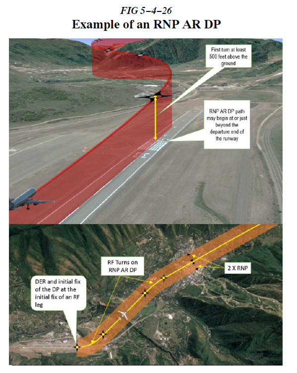 g. RNP AR Departure Procedures(RNP AR DP). RNP AR DP를 수행하기 위해선 운영자는 RNP AR approach authorization을 반드시 갖추어야 한다. RNP AR DP는 RNP 0.30을 사용할 수 있고, standard climb gradients 이상을 포함할 수 있으며, RF turns를 포함할 수 있다. RNP AR DP와 연관된 close in RF turns가 DEP(departure end of the runway)에서 시작될 수 있다. 구체적인 자격 지침을 위해 AC 90-101을 참조해야 한다.