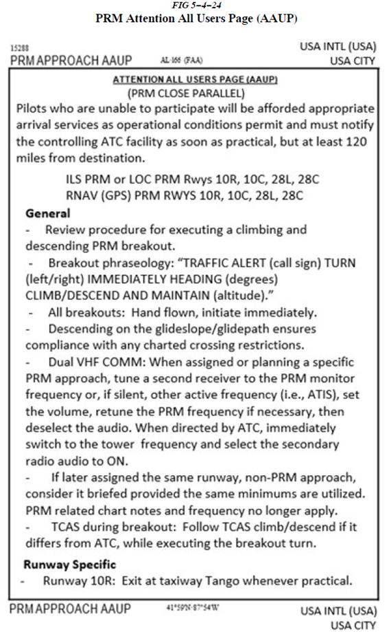 f. Attention All Users Page(AAUP). PRM operation이 수행되는 경우 AAUP의 “General” 섹션은 특정 공항의 모든 PRM approaches와 관련된 정보들을 조종사에게 알려준다. 이 섹션은 전체적으로 브리핑 되어야 한다. “Runway Specific” 섹션의 경우 착륙에 사용될 활주로와 관련된 항목만을 브리핑하면 된다. (그림 5-4-24 참조.) 특정 공항에서의 여러 PRM approach charts에 대해 하나의 AAUP가 사용된다. PRM clearance를 수락할 수 없는 경우 ATC에 알려야 하는 조건 또한 제시되어 있다. AAUP의 “General” 섹션은 다음 사항들을 다룬다: