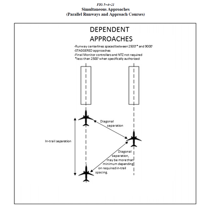 c. 활주로 중심선들이 2,500ft ~ 3,600ft로 분리된 경우 adjacent final approach course에 놓인 다음 항공기와 최소 1.0NM의 대각선 레이더 분리가 필요하다. 활주로 중심선들이 3,600ft ~ 8,300ft로 분리된 경우에는 adjacent final approach course에 놓인 다음 항공기와 최소 1.5NM의 대각선 레이더 분리가 필요하다. 활주로 중심선들이 8,300ft ~ 9,000ft로 분리된 경우에는 최소 2NM의 대각선 레이더 분리가 제공된다. 활주로 끝단으로부터 10NM 이내에서 동일한 final approach course에 놓인 항공기는 최소 3NM(특정 경우에는 2.5NM)의 레이더 분리를 제공받는다. 또한 parallel final approach course로 선회하는 항공기들 사이에 최소 1,000ft의 수직 분리가, 혹은 최소 3마일의 레이더 분리가 제공된다.