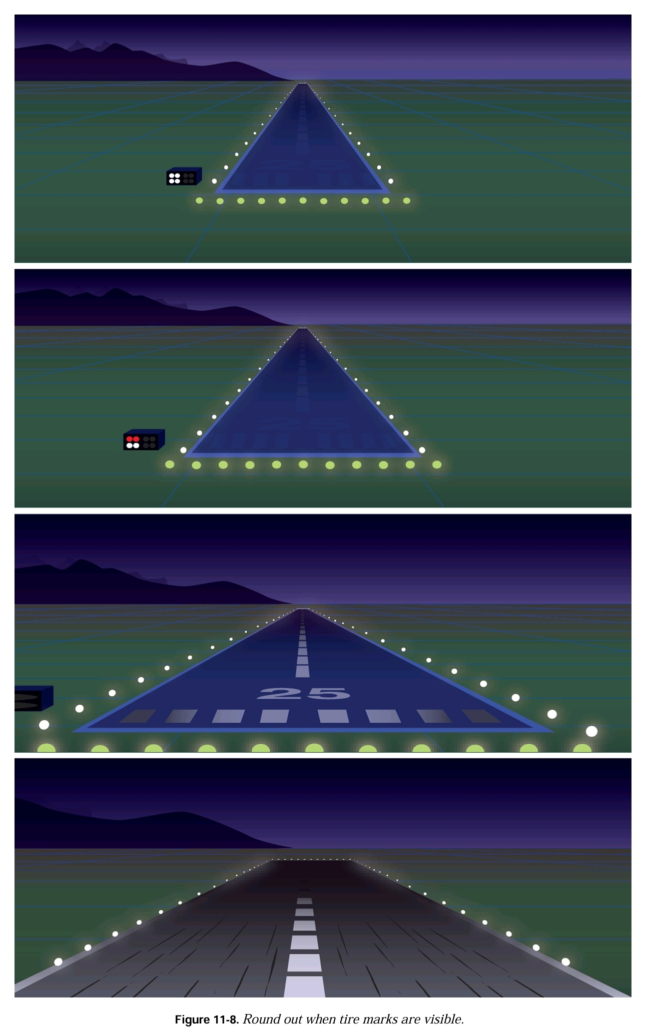 주간 착륙과 동일한 방법으로 round out과 touchdown을 수행한다. 야간에는 착륙 지역 참조물들이 부족해서 고도, 속도, 그리고 침하율에 대한 판단이 저하된다. 경험이 적은 조종사는 너무 높은 곳에서 round out을 수행하려는 경향을 보일 수 있다. landing lights가 활주로에 반사되서 활주로 타이어 자국이 선명하게 보이기 전까지 하강하면 round out 시작 지점을 식별할 수 있다. 이 지점에서 부드럽게 round out을 시작하고 throttle을 점점 idle로 감소시킨다. [그림 11-8] landing lights 없이 착륙하는 경우에는 end of the runway에 위치한 활주로 등화가 비행기의 기수보다 높아지려 할 때 round out을 시작할 수 있다. 이는 부드럽고 시기적절한 round out을 필요로 하며 조종사는 비행기가 활주로에 천천히 착지할 수 있도록 power와 pitch를 조절해서 활주로 표면을 감지해야 한다. 야간 훈련에는 항상 비상 절차로 blackout(정전)landing이 포함되어야 한다.