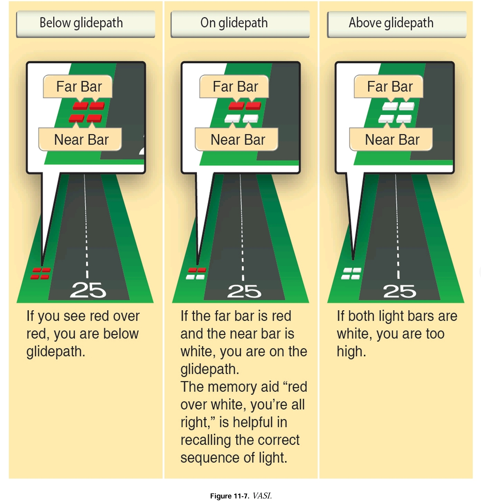 조종사는 권장 대기속도를 유지해야 하고 주간과 같은 방법으로 접근 및 착륙을 수행해야 한다. 야간 착륙 도중 low, shallow approach는 적절하지 못하다. base leg와 final approach에 대한 비행기 위치를 altimeter • VSI와 끊임없이 비교해야 한다. VASI(Visual Approach Slope Indicator)는 올바른 glide path를 유지하는데 필수적인 보조 장치이다. [그림 11-7]