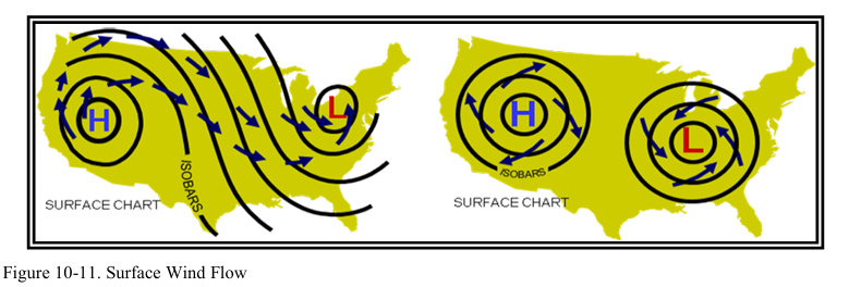 수면 위에서는 등압선과 지상풍(surface wind) 사이의 각도가 약 10°이며 험준한 지형 위에서는 최대 45°까지 증가한다. 그 결과로 북반구에서는 지상풍이 고기압으로부터 바깥을 향해 시계방향으로 회전하고 저기압 안쪽을 향해 반시계방향으로 회전한다(그림 10-11 참조). 산악 지형에서는 엄청난 마찰, 그리고 지역 지형이 압력에 미치는 영향으로 인해 지상풍을 기압 경도와 연관시키는데 어려움이 있다.