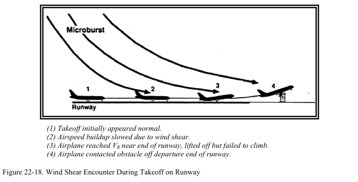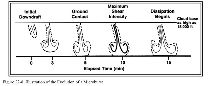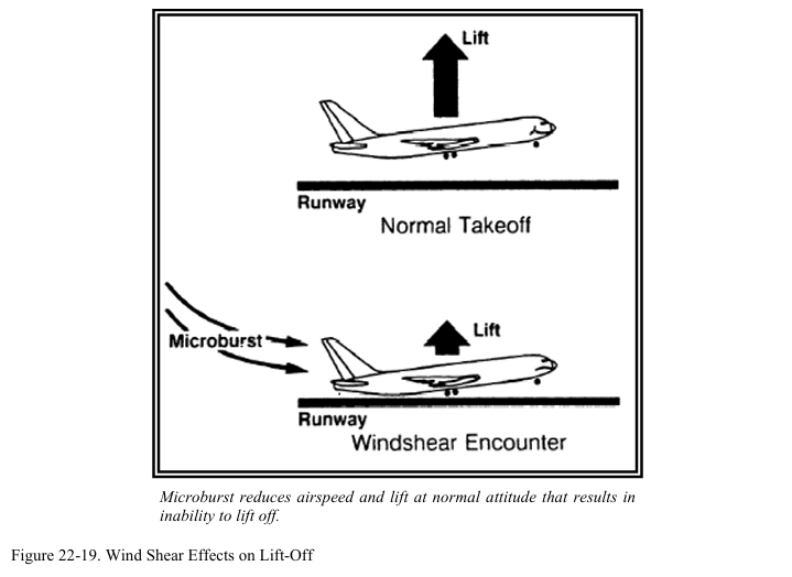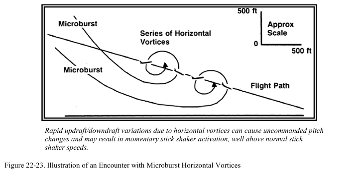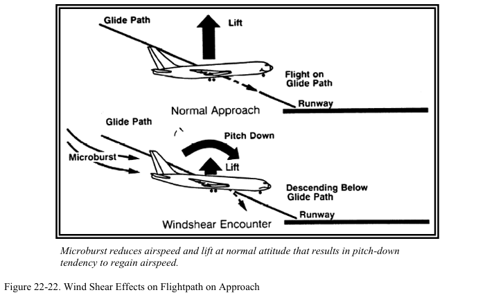 다운버스트나 마이크로버스트는 이륙 후 상승중인 항공기와 착륙을 위해 접근중인 항공기에게 위험하다. 이러한 구간에서 항공기는 낮은 속도를 사용한다. 풍속의 급격한 변화는 양력 상실과 추락으로 이어질 수 있다. 착륙 도중 만약 조종사가 headwind shear에 대응해서 출력을 줄이고 기수를 낮추었는데 tailwind shear가 발생하면 항공기가 nose-low, power-low 상태가 되어서 회복이 더 어려워진다(그림 22-13 참조). 이로 인해 항공기가 실속에 빠지거나 활주로에 미치지 못할 수 있다.
