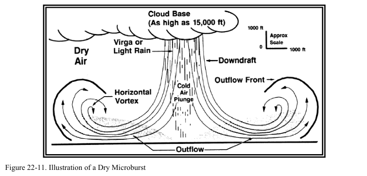 전형적인 뇌우로부터 하강하는 공기 기둥은 그 규모가 크다. 대류 구름, 소나기 세포, 그리고 뇌우 세포는 때때로 다운버스트(downburst)라 불리는 강력한 하강기류를 생성하는데 이는 보통 심한 바람과 급변풍(wind shear)을 발생시킨다. 다운버스트는 조종사에게 위험한 상황들을 발생시킬 수 있으며 현재까지 많은 LLWS 사고들의 원인이 되어왔다(그림 22-7 참조). 더 작고 지속 시간이 짧은 다운버스트는 마이크로버스트(microburst)라 불린다.