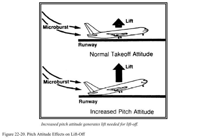 만약 정상 이륙 속도까지 가속할 활주로도 부족하고 정지할 활주로도 부족하다면 이륙 및 안전한 상승을 위해 VR 미만의 속도에서 rotate를 수행해야할 수 있다. 이때 충분한 양력을 얻기 위해 높은 pitch attitude가 필요할 수 있다(그림 22-20 참조). 높은 pitch attitude로 인해 테일스트라이크(tailstrike)가 발생하는 것을 방지하기 위해 조종사들은 과거 훈련 도중 VR 미만의 속도에서는 rotate를 수행하지 않도록 주의를 받는다. 허나 급변풍을 마주한 상황에서는 남은 활주로 내에서 이륙하기 위해 낮은 대기속도에서 정상 이륙 자세를 향해 rotate를 수행해야 할 수 있다. 이는 테일스트라이크로 이어질 수 있다. 의도치 않게 급변풍을 마주하였을 때 이를 처리하기 위해선 조종사가 일반적으로 사용되는 기법과는 다른 기법을 적용할 준비가 되어있어야 한다.