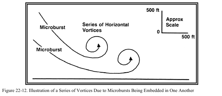 동일한 기상 시스템 내에서 두 개 이상의 마이크로버스트가 발생할 수 있다. 따라서 이미 마이크로버스트를 확인하였거나 경험한 조종사는 또 다른 마이크로버스트를 경계해야 한다. 만약 마이크로버스트가 여러 개 존재하면 서로 겹쳐진 마이크로버스트들로 인해 지표면 근처에서 수평방향으로 흐르는 일련의 소용돌이들이 형성될 수 있다(그림 22-12 참조). 이 소용돌이들과 관련된 조건은 하강기류뿐만 아니라 매우 강력한 상승기류와 roll force를 발생시킬 수 있다.